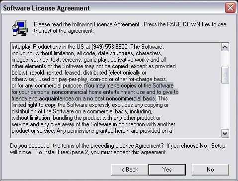 By drink | Wed August 01, 2007 Image media Freespacesetupdialog.jpg Image Galleries Freespace 2 A screenshot of the dialog provided during Freespace 2 installation, showing the license clause permitting redistribution to "friends and acquaintances." Tags video game open source flight simulator space Log in or register to post comments