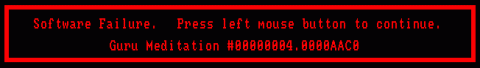 By drink | Tue September 12, 2006 Image media Guru_meditation.gif Image Galleries Errors http://en.wikipedia.org/wiki/Guru_Meditation Tags Amiga error screenshot fake Log in or register to post comments
