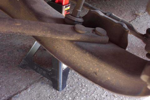 As you might suspect, you should start by loosening the lug nuts on the front wheels, and jacking up the front end of the car. You can probably do this one side at a time but in my experience front suspension work is best done with both wheels off the ground to minimize annoyance from the sway bar. I have two jacks so this was extremely easy, Kragen tends to have specials on them all the time and I picked up two jacks, four stands, a folding lug wrench (neat!) and a creeper for $65 in all. This plus one more lug wrench is enough for two people to get a 240 up in the air and stable in roughly no time at all. You can do it fine with the factory jack, but you're going to need jack stands and if you get the stuff on sale, you can get a decent hydraulic jack and stands for about what you'd pay for stands alone.