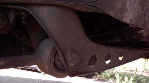 This is the original factory T/C rod. Note (in the large version) that it has cracked and the rubber has separated. This is actually the opposite side of the car from the rest of the pictures, but I removed the passenger side rod before photographing it. I flipped the picture around so they'd all look like they matched. Start by removing the nut from the other end of the bolt whose head you can see in the picture. It's got a 17mm head on it.